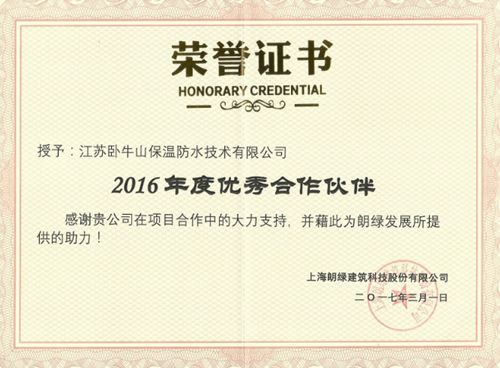 卧牛山荣获朗绿修建科技“2016年度优异合作伙伴”