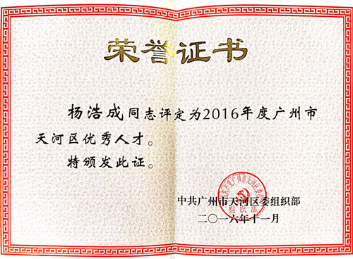 广东东方77体育董事长杨浩成获评“2016年度广州市天河区优异人才”